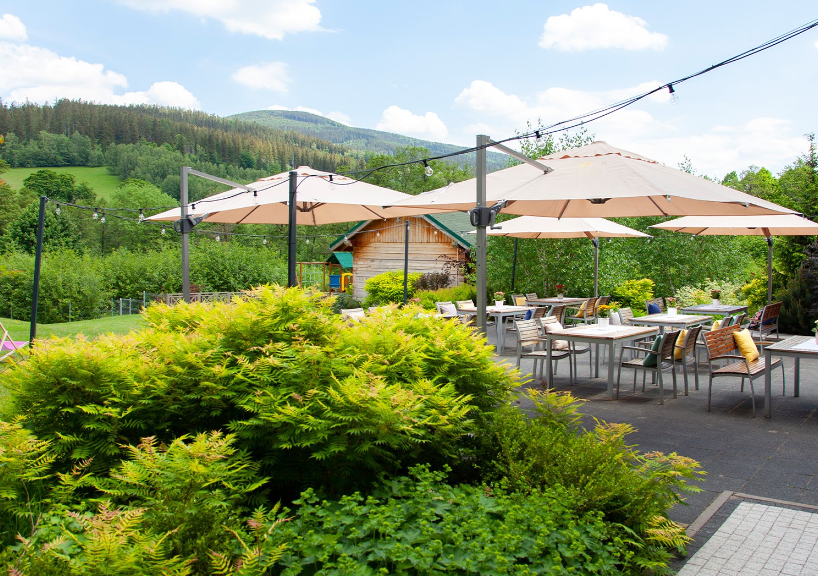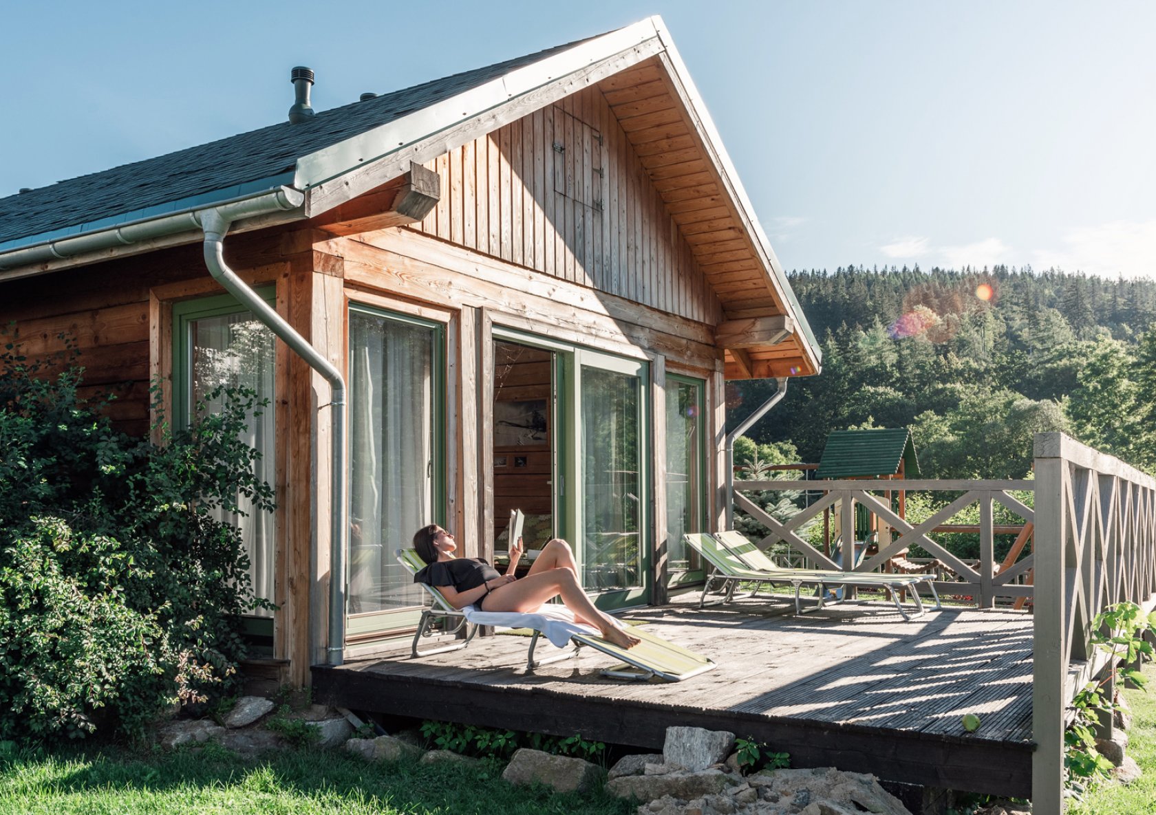 Rano śniadanie z widokiem na góry, potem spacer albo górska wycieczka, może wspólna przejażdżka rowerem lub po prostu leniwe leżenie w ogrodzie. Po południu basen, sauna, masaż, a wieczorem kolacja, dobre wino i spokojny wieczór w lobby barze albo w domku saunowym, który wynajmiesz na wyłączność.